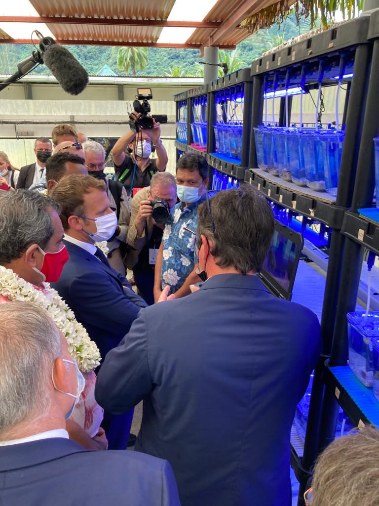 Enfin, après une photo de groupe avec toute l’équipe du CRIOBE, le dernier volet de la séquence au laboratoire a été le transfert de la connaissance fondamentale vers le grand public illustré par la séquence au Fare Natura, écomusée issu du CRIOBE sous l’impulsion de Serge Planes, que le président Emmanuel Macron a inauguré au terme de sa visite.